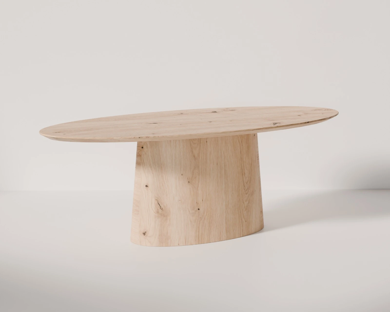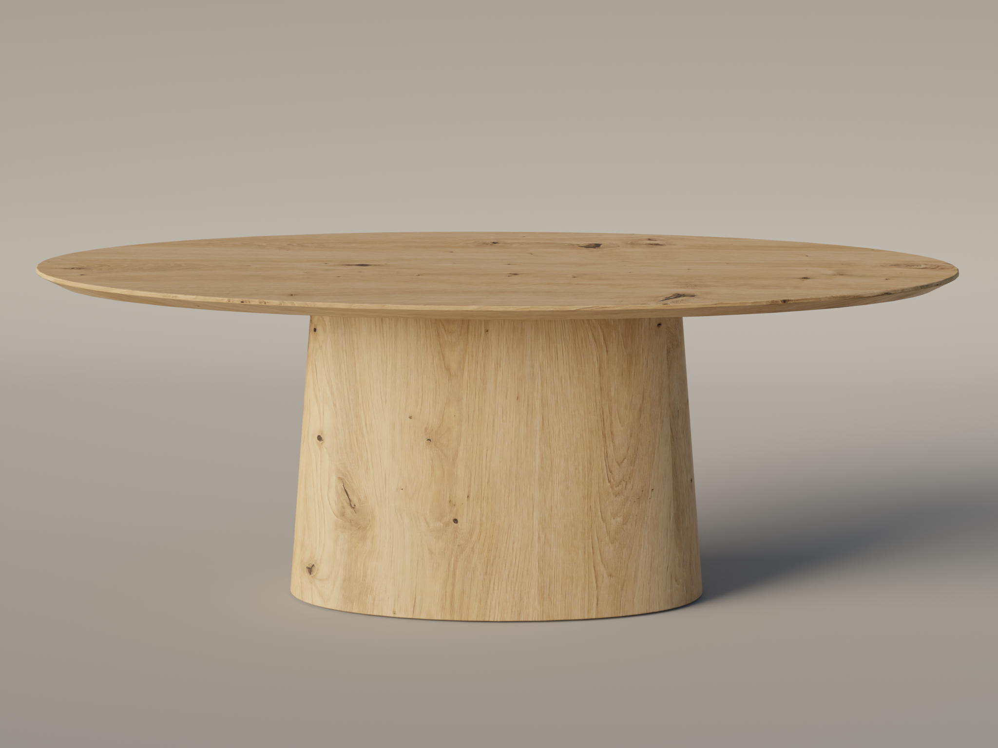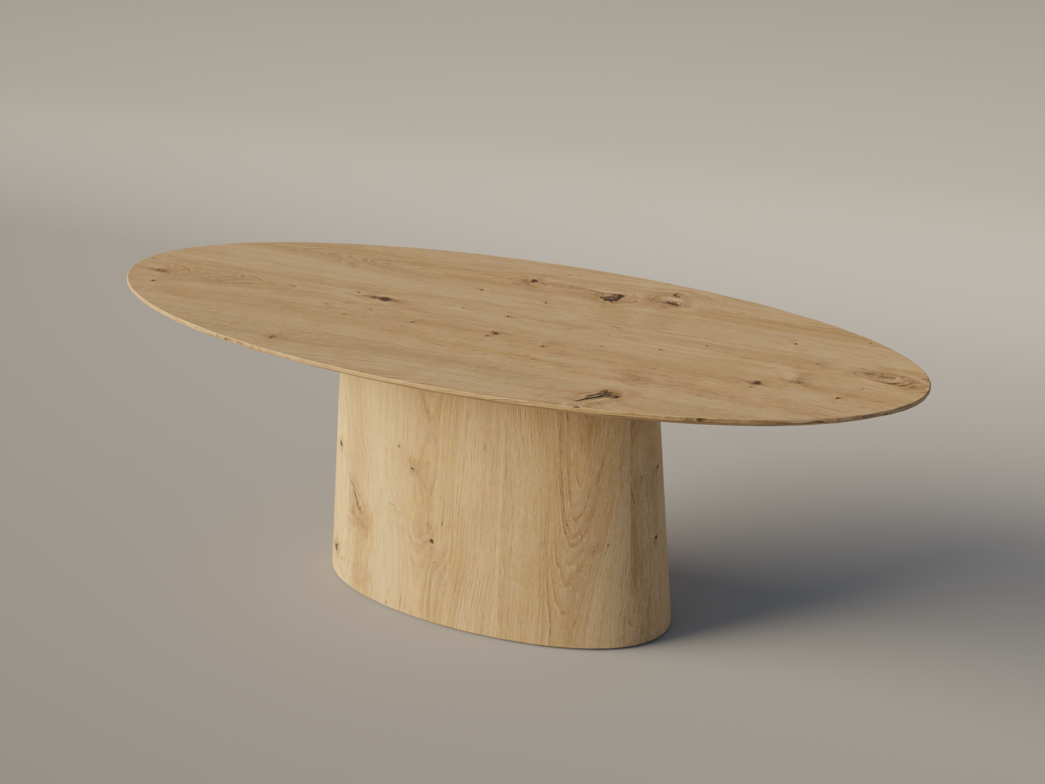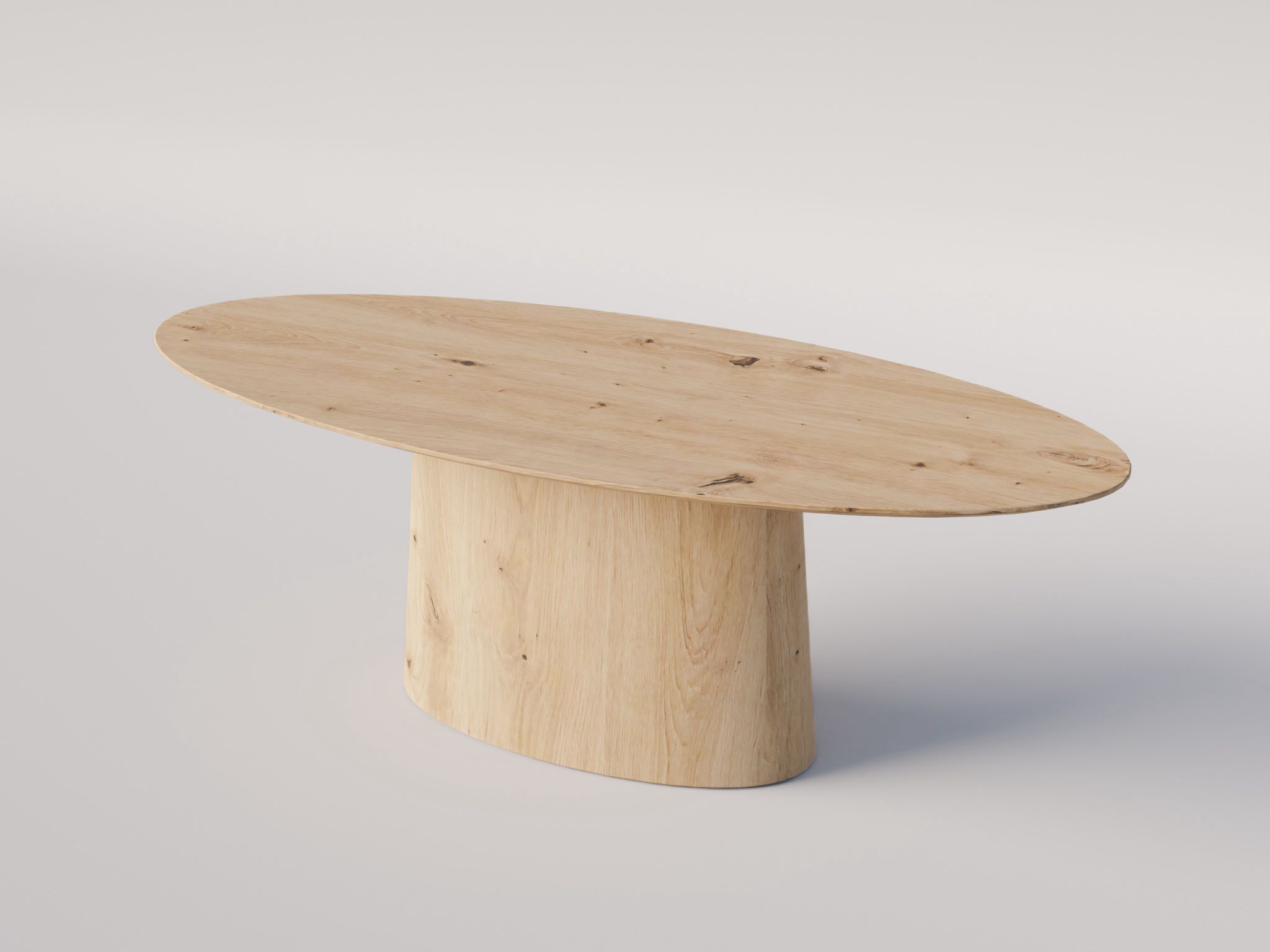 Stół VORM to połączenie nowoczesnej formy z naturalnym charakterem litego drewna. Owalny blat wykonany z litego drewna podkreśla autentyczne usłojenie i unikalną strukturę materiału, dzięki czemu każdy egzemplarz ma swój indywidualny charakter. Centralna podstawa została pokryta trwałym laminatem HPL, który zapewnia wysoką odporność na codzienne użytkowanie oraz nadaje bryle nowoczesny, minimalistyczny wygląd.