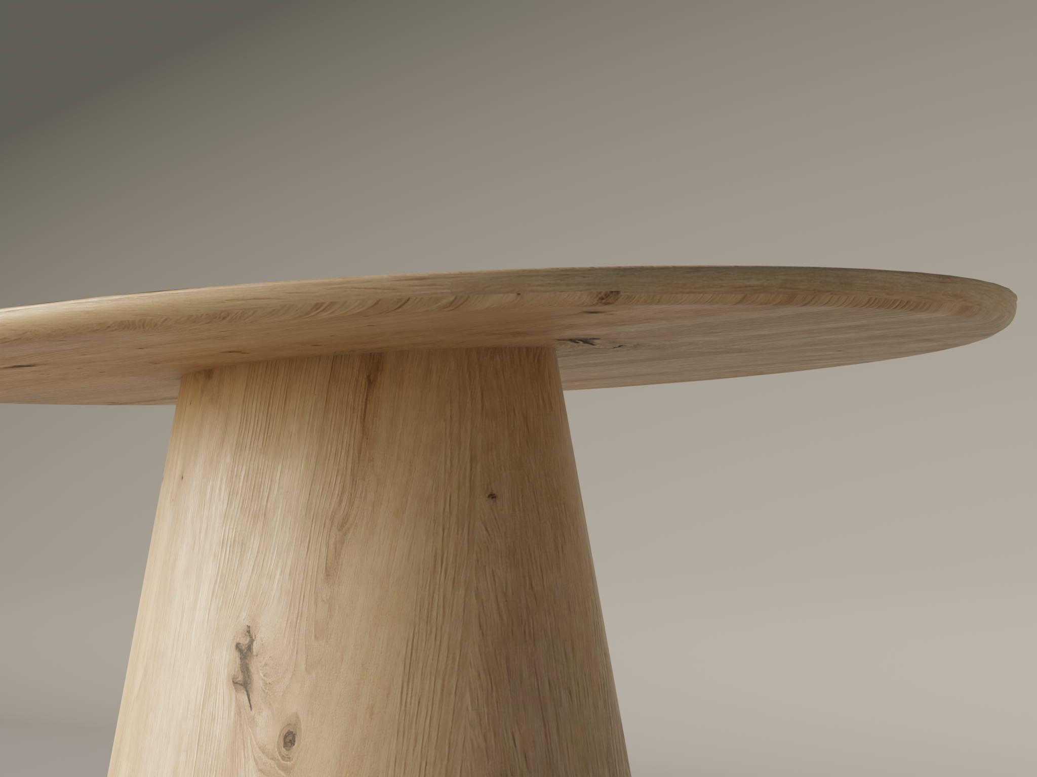 Każdy element stołu został dopracowany z dbałością o proporcje i detale, dzięki czemu całość prezentuje się lekko, mimo solidnej konstrukcji. Centralna podstawa gwarantuje komfort użytkowania oraz swobodę aranżacji przestrzeni wokół stołu.